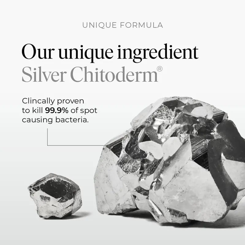 Discover the breakthrough serum that redefined clear skin. This dermatologist-approved formula combines Silver Chitoderm™. a patented fusion of silver and chitoderm. to create an invisible protective barrier that kills 99.9% of breakout-causing bacteria while calming irritation and redness. Designed to reduce blemishes. fade stubborn marks. and balance hydration. it leaves skin visibly clearer. smoother. and more radiant with every use.